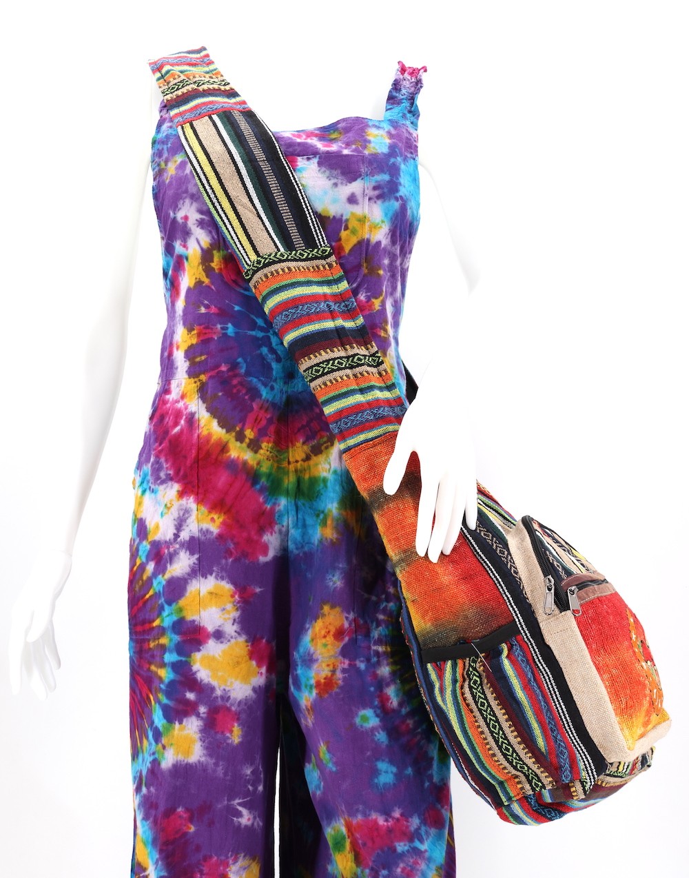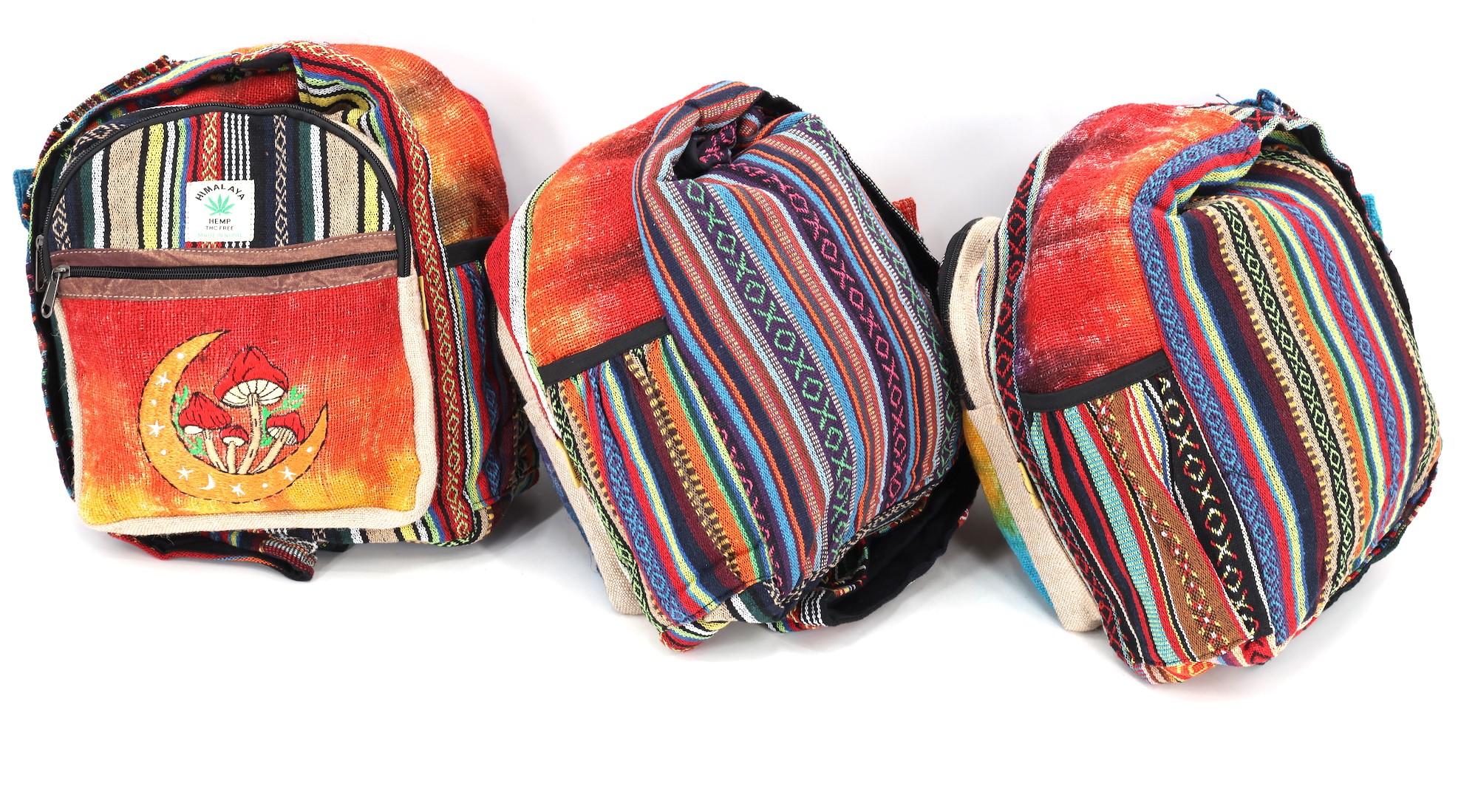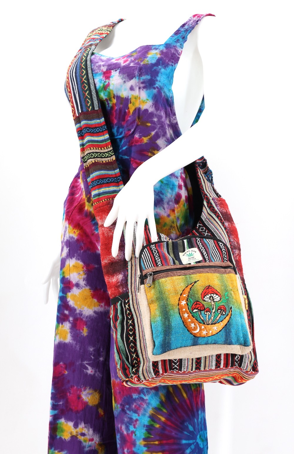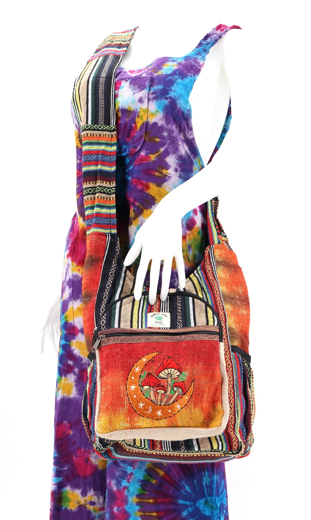 A versatile and beautiful Moon Mushroom embroidery colorful 100% Natural Handwoven Hemp Crossbody Bag stitched by talented artisans in Himalaya range of Nepal. Purchasing means supporting underprivileged Nepalese communities who help make these bags.