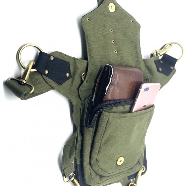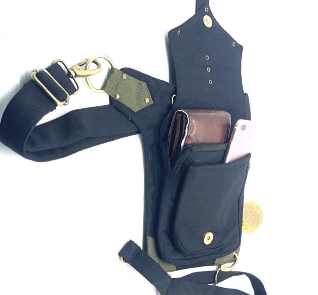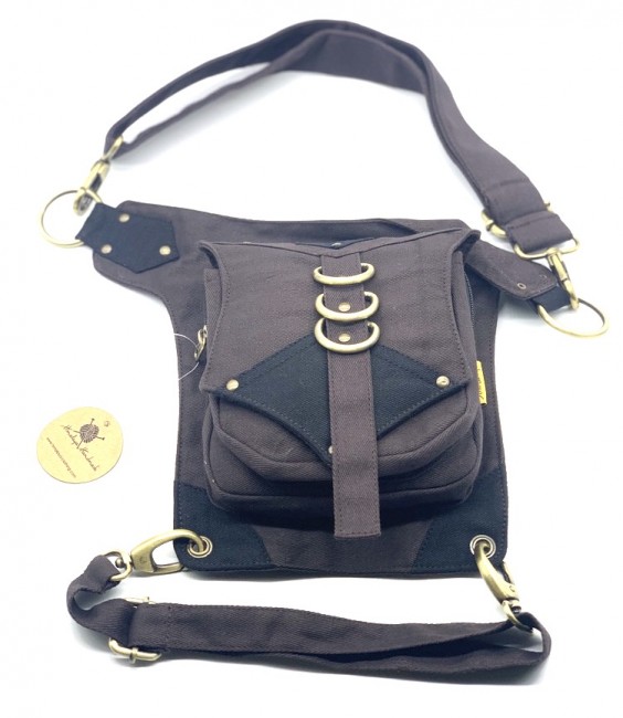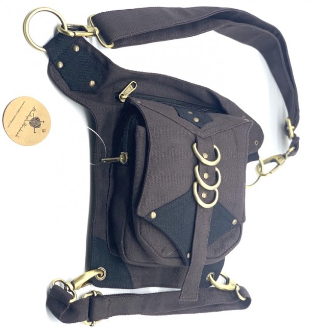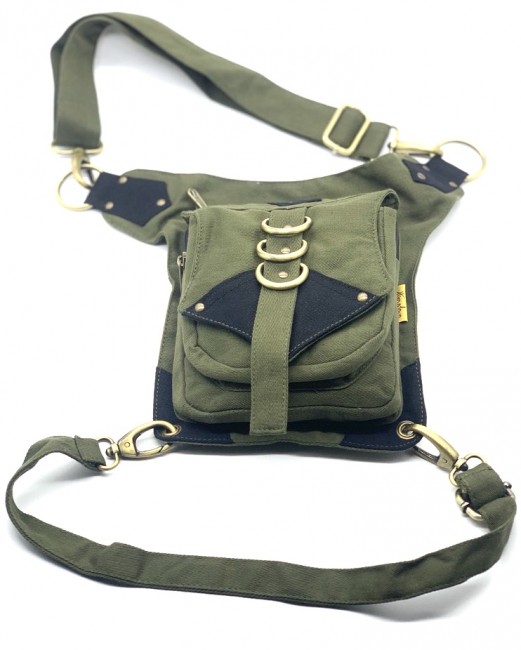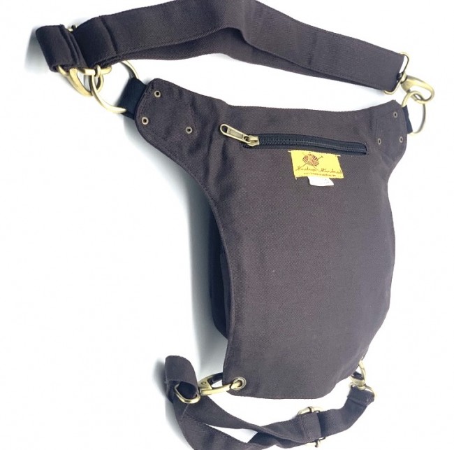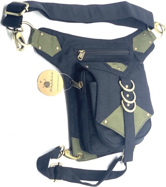An adjustable hip bag, can be worn around the waist/hip or extend the strap to make it a shoulder bag! Each end of the straps has a large clip, so they can be attached in many different ways depending on your needs. Wearing a skirt? The brass hoops on the front can be used as decoration, or clipping on keychains and charms. The fanny pack also has a thigh strap which contains a clip which can be used as an extra layer of protection that can be worn around your thigh.