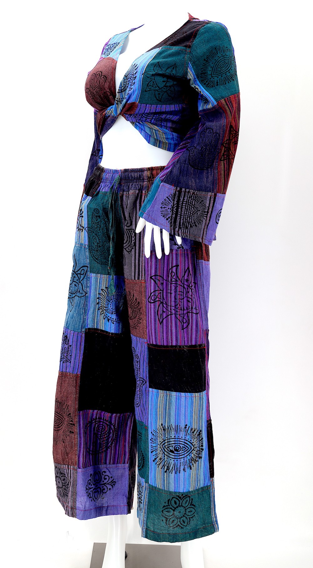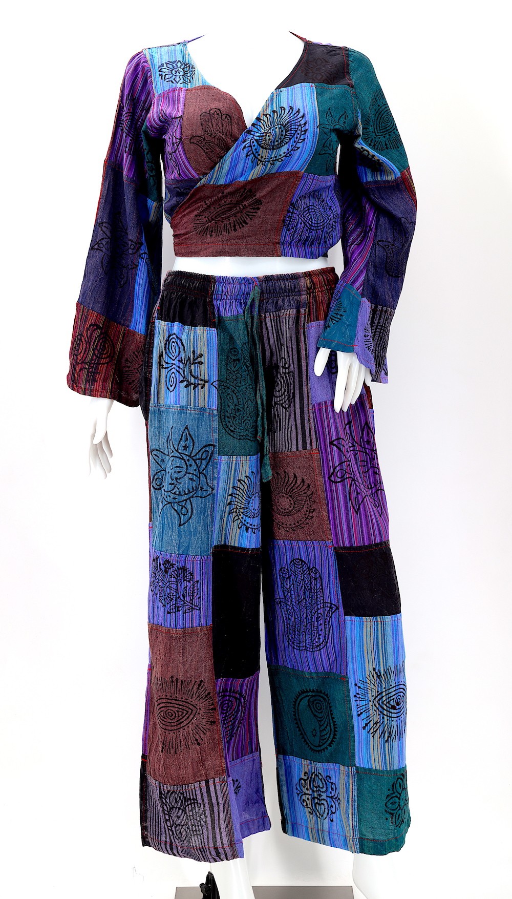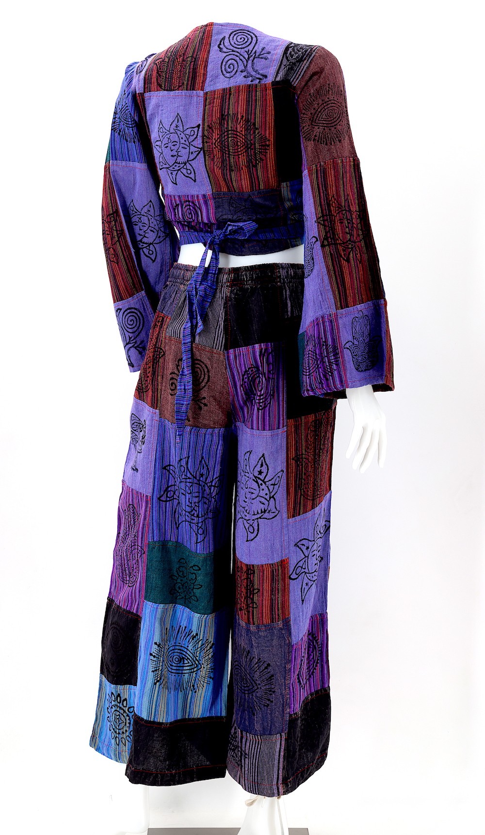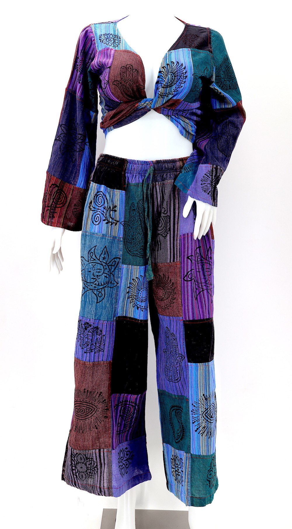Every clothing item is meticulously handmade, reflecting the care and consideration put into their creation, resulting in unmatched quality. Because our products are handmade, the patchwork colors and patterns on each pair of trousers and tops may vary, making each one unique. The provided image serves as a general representation of the product's appearance.