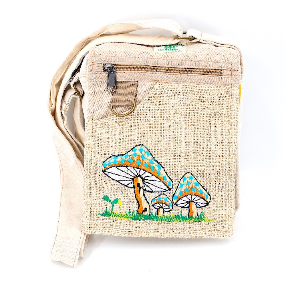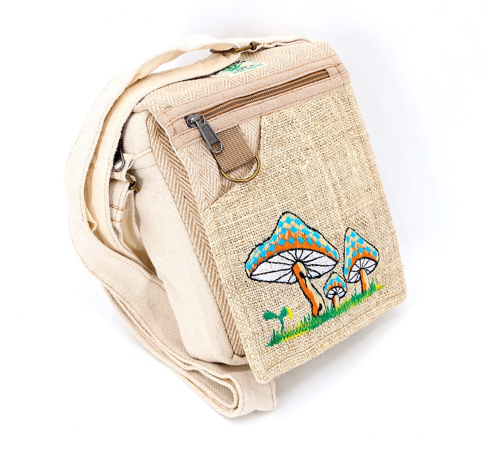 A versatile and beautiful Mushroom Hand Embroidered Hemp Passport Crossbody Bag made with 100 percent natural THC-free Himalaya hemp. Stitched and assembled by the most talented artisans in Nepal.