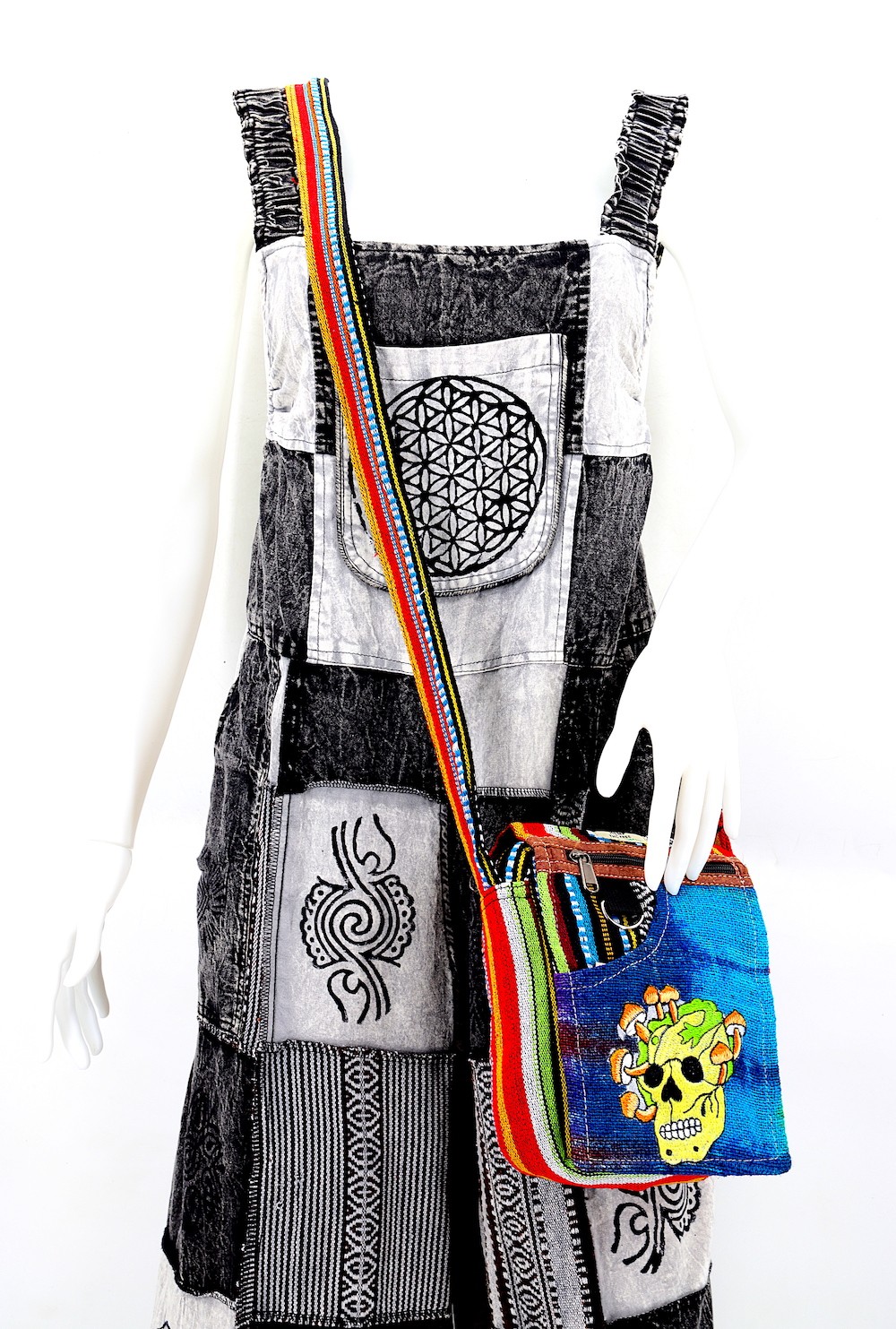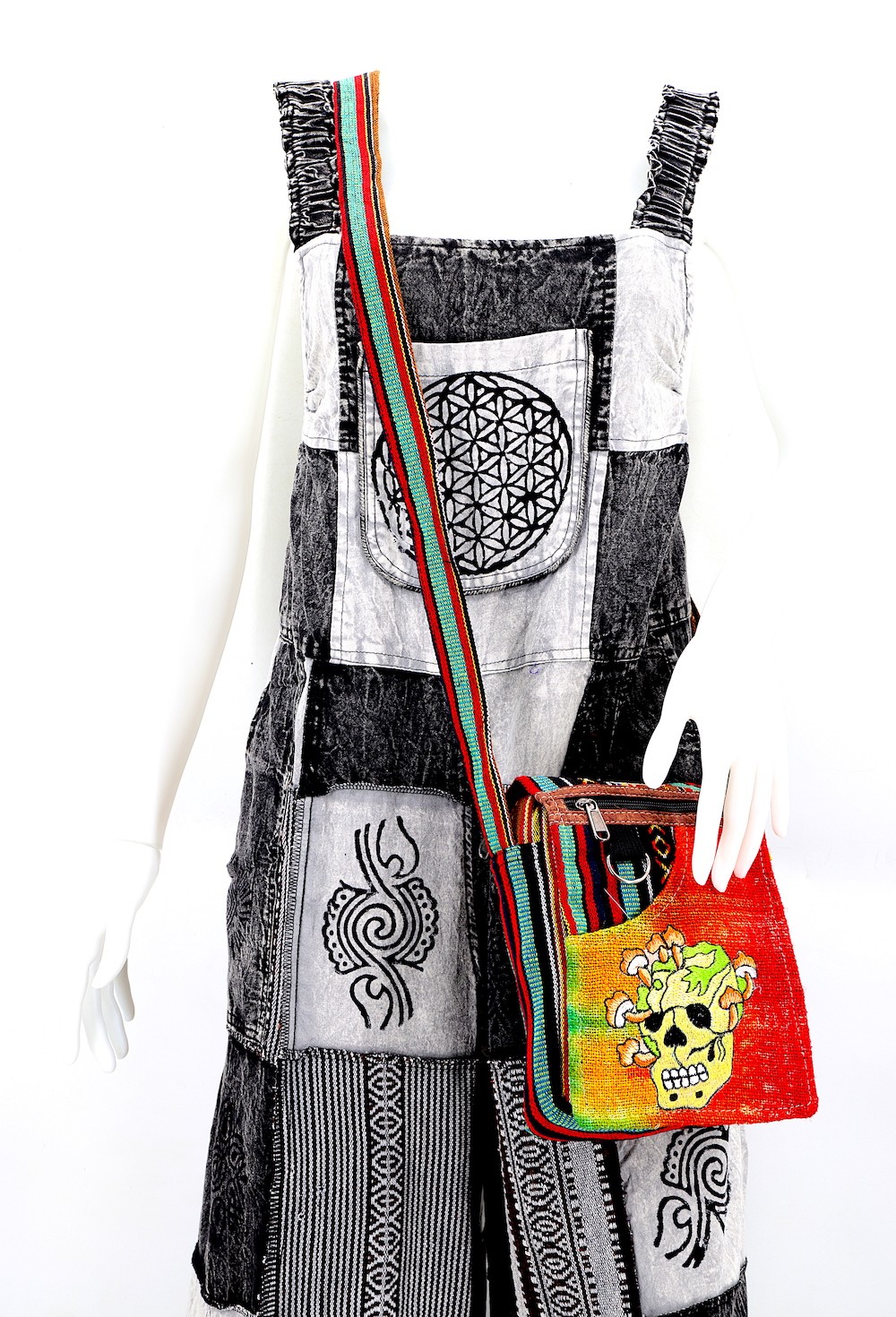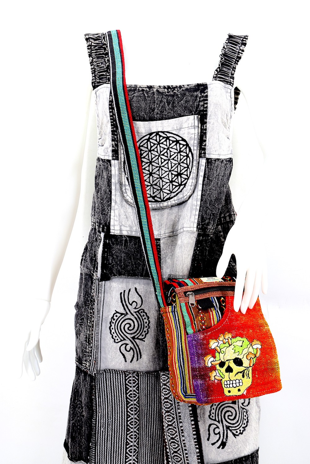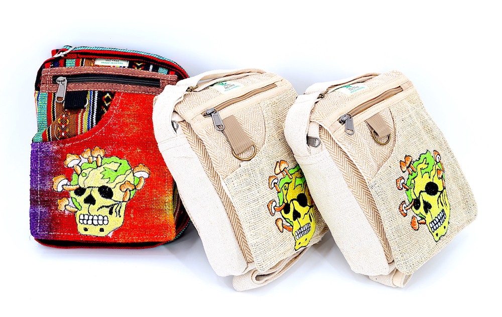 A versatile and beautiful Skull Mushroom Hand Embroidered Hemp Passport Crossbody Bag made with 100 percent natural THC-free Himalaya hemp. Stitched and assembled by the most talented artisans in Nepal.