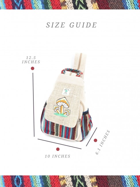 - At Himalaya Handmade we are known for creating the modern Mini hemp backpacks that are now available in a vast array of design and colors. Our Mini backpack with multicolor Aztec pattern which is made from eco-friendly natural hand-woven hemp and cotton fabric which is beautifully handcrafted in Nepal, they are of high quality and our backpacks have everything that you will need. You will not find products of higher quality anywhere else. All of our bags are sourced from the mountainous regions of Nepal and are all 100% Handmade. This backpack features are it has a unique multi colored pocket. Handcrafted this uniquely versatile Backpack comes with 2 pockets on the front both zippered and secured with a Velcro, the larger front pocket also has a zippered anti-theft pocket as well as compartment that can be used to store objects as large as 12 inches, There is also a secret back pocket which is zippered and can be used to contains various items, the bag also comes equipped with 2 water bottle holders. The bag has extremely strong construction, it has strong original two metal zippers on main compartment, soft padded straps and made from 100% Hemp, the entire bag is extremely strong but also breathable. Color of these bag will not be exact because arrangement of the pattern and the nature of these bags being handmade can cause the colors and patterns to be slightly different. Images for this bag are an overall example to what the bag looks like. Every bag is handmade and therefore unique