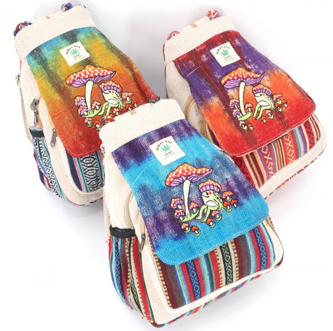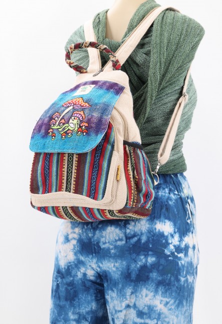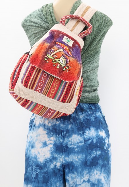 - At Himalaya Handmade we are known for creating the modern Mini hemp backpacks that are now available in a vast array of design and colors. Our Mini backpack with multicolor Aztec pattern which is made from eco-friendly natural hand-woven hemp and cotton fabric which is beautifully handcrafted in Nepal, they are of high quality and our backpacks have everything that you will need. You will not find products of higher quality anywhere else. All of our bags are sourced from the mountainous regions of Nepal and are all 100% Handmade. This backpack features are it has a unique multi colored pocket. Handcrafted this uniquely versatile Backpack comes with 2 pockets on the front both zippered and secured with a Velcro, the larger front pocket also has a zippered anti-theft pocket as well as compartment that can be used to store objects as large as 12 inches, There is also a secret back pocket which is zippered and can be used to contains various items, the bag also comes equipped with 2 water bottle holders. The bag has extremely strong construction, it has strong original two metal zippers on main compartment, soft padded straps and made from 100% Hemp, the entire bag is extremely strong but also breathable. Color of these bag will not be exact because arrangement of the pattern and the nature of these bags being handmade can cause the colors and patterns to be slightly different. Images for this bag are an overall example to what the bag looks like. Every bag is handmade and therefore unique.