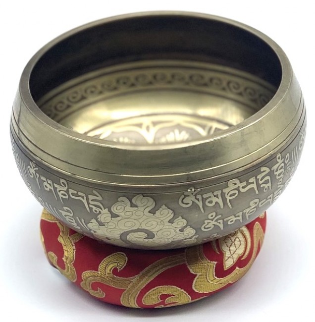 Buddhist Tibetan Om engraved in the center, surrounded by Buddhist themed engraving on the inside and the Buddhist Chant outside