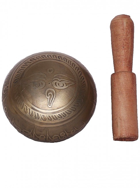A beautiful authentic machine made singing bowl inscribed with spiritual Tibetan prayers script on the outer wall and it has an embossed Buddha eyes design on the outside bottom. In the inner bottom it has a abstract Tibetan Ashtamangala design etched on. It is made from the combination of seven different metals such as iron, mercury, copper, tin, lead, gold and silver. It gives out a melodious tone when played. The singing bowl creates a relaxing and harmonious sound which is used for yoga, music therapy, to clean the atmosphere around us and sound healing. It comes with free wooden Mallet and Silk cushion.