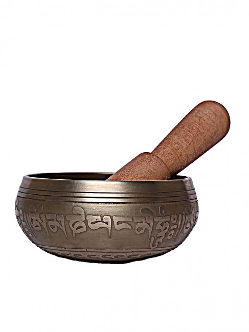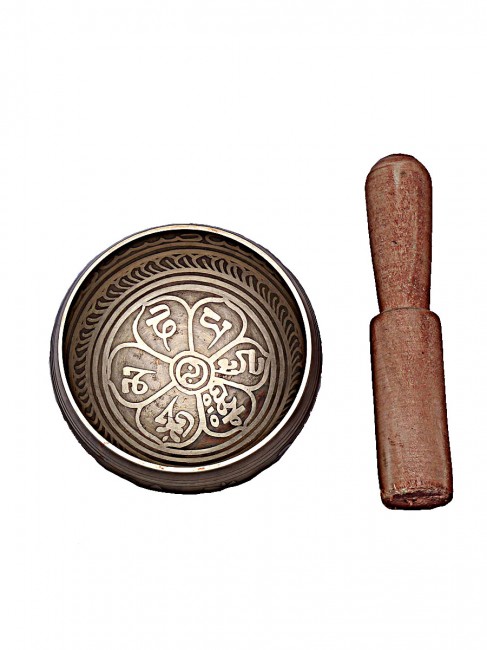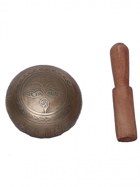 A beautiful authentic machine made singing bowl inscribed with spiritual Tibetan prayers script on the outer wall and it has a abstract Buddha eyes design on the outside bottom. In the inner bottom it has an enchanting symbolic spiritual Tibetan letter etched on. It is made from the combination of seven different metals such as iron, mercury, copper, tin, lead, gold and silver. It gives out a melodious tone when played. The singing bowl creates a relaxing and harmonious sound which is used for yoga, music therapy, to clean the atmosphere around us and sound healing. It comes with free wooden Mallet and Silk cushion.