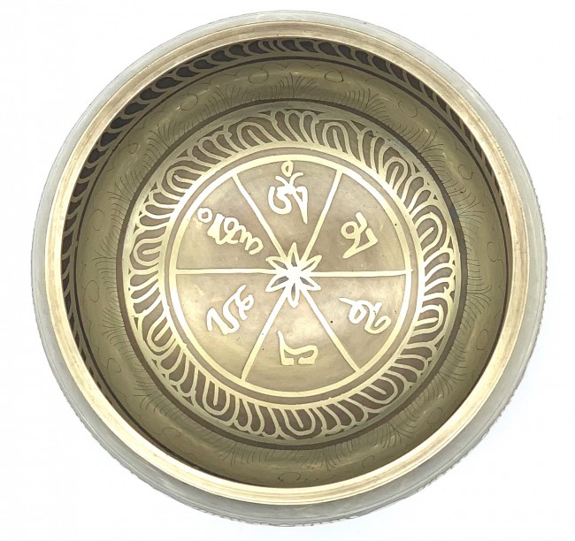 Buddhist Chant engraved in the center, surrounded by Buddhist themed engraving on the inside and the outside