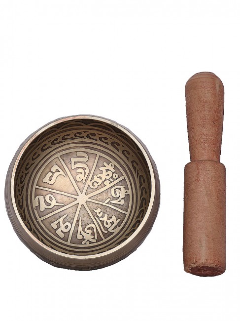 A beautiful authentic machine made singing bowl inscribed with spiritual Tibetan prayers script on the outer wall and it has an embossed Buddha eyes design on the outside bottom. In the inner bottom it has an enchanting symbolic Tibetan letter design etched on. It is made from the combination of seven different metals such as iron, mercury, copper, tin, lead, gold and silver. It gives out a melodious tone when played. The singing bowl creates a relaxing and harmonious sound which is used for yoga, music therapy, to clean the atmosphere around us and sound healing. It comes with free wooden Mallet and Silk cushion.