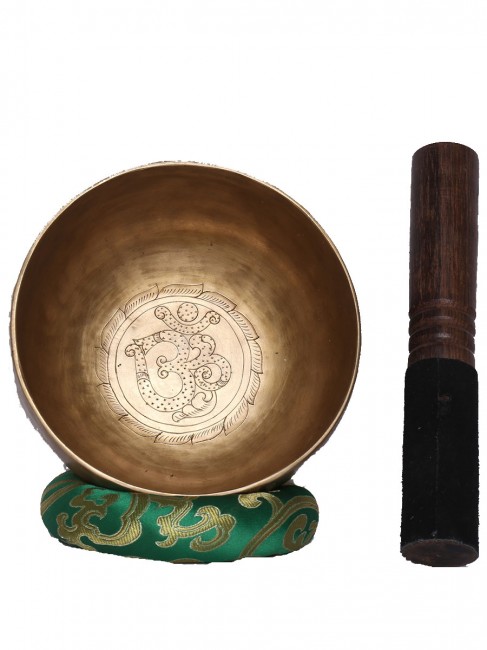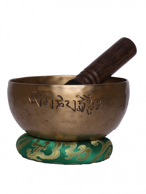 A beautiful inscribed hand hammered singing bowl with an embossed Tibetan mantra design on outside and abstract Om design inside. It is made from the combination of seven different metals. The singing bowl produces a relaxing and harmonious sound which is used for yoga, music therapy and sound healing. Comes with free wooden Mallet and Silk cushion.