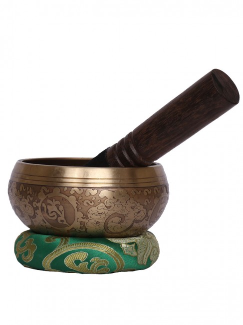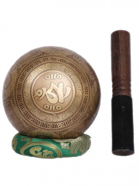 A beautiful authentic machine made singing bowl inscribed with big symbolic spiritual Tibetan letters on the outer wall with other intricate design and it has an enchanting Tibetan letter Om design on the outside bottom. In the inner bottom it has an embossed Buddha eyes design etched on. It is made from the combination of seven different metals such as iron, mercury, copper, tin, lead, gold and silver. It gives out a melodious tone when played. The singing bowl creates a relaxing and harmonious sound which is used for yoga, music therapy, to clean the atmosphere around us and sound healing. It comes with free wooden Mallet and Silk cushion.
