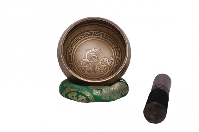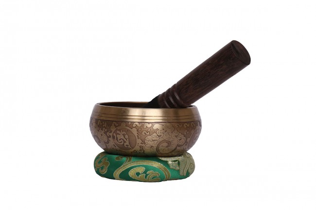 A beautiful authentic machine made singing bowl inscribed with big symbolic spiritual Tibetan letters on the outer wall with other intricate design and it has an enchanting Spiritual Tibetan letter on the outside bottom. The inner bottom has abstract Sankha design etched on. It is made from the combination of seven different metals such as iron, mercury, copper, tin, lead, gold and silver. The singing bowl creates a relaxing and harmonious sound which is used for yoga, music therapy, to clean the atmosphere around us and sound healing. It comes with free wooden Mallet and Silk cushion.