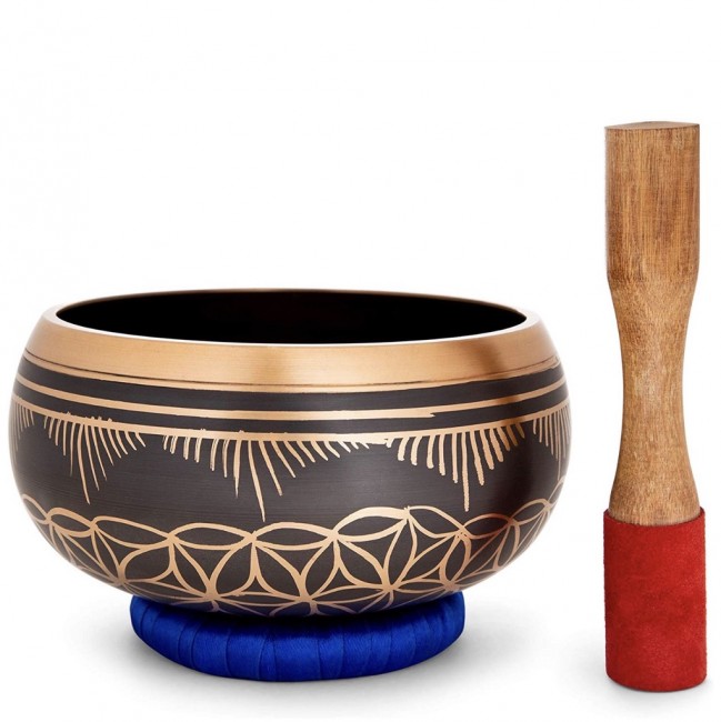 A beautiful authentic machine made dark brown varnished singing bowl inscribed with spiritual Tibetan prayers script on the outer wall and it has abstract Buddha eyes on the outside bottom. In the inner bottom it has an enchanting spiritual Tibetan letter design etched on. It is made from the combination of seven different metals such as iron, mercury, copper, tin, lead, gold and silver. It gives out a melodious tone when played. The singing bowl creates a relaxing and harmonious sound which is used for yoga, music therapy, to clean the atmosphere around us and sound healing. It comes with free wooden Mallet and Silk cushion.