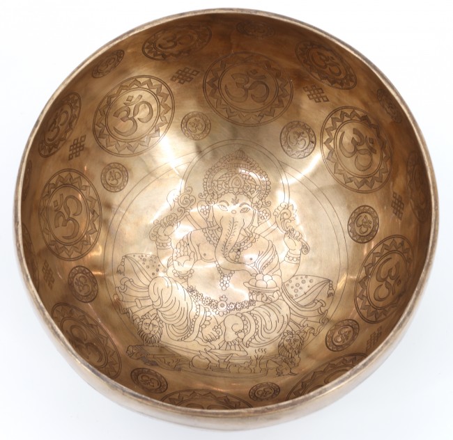 Ganesha engraved in the center, surrounded by Om symbol as well as Buddhist themed engraving on the inside and the outside