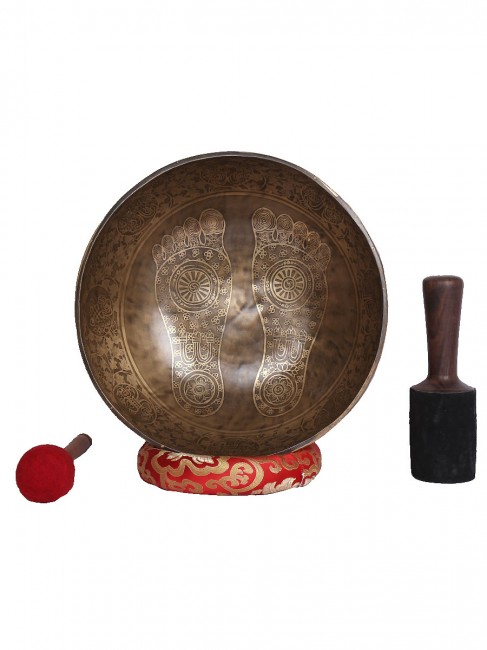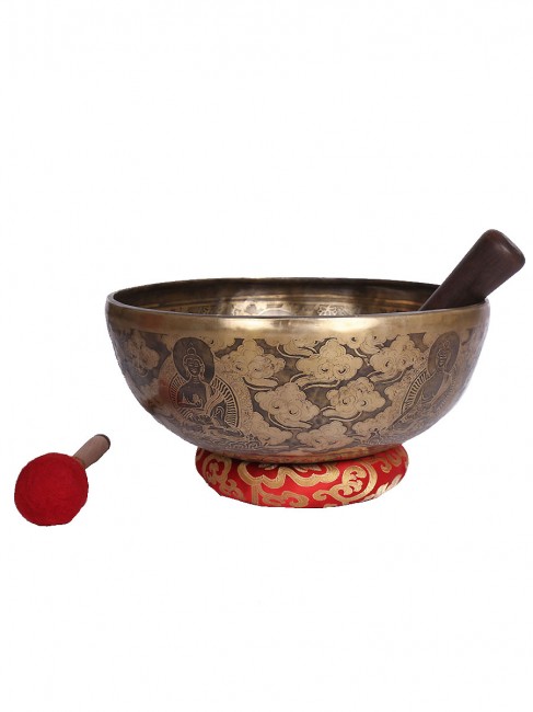 A beautiful inscribed hand crafted singing bowl with intricate five Buddha design around the outer wall also it’s embossed with other intricate design on outside and it has abstract Bajra design on the outside bottom. The inner bottom has intricate Buddha feet design etched on. It is made from the combination of seven different metals. The singing bowl produces a relaxing and harmonious sound which is used for yoga, music therapy, to clean the atmosphere around us and sound healing. It comes with free wooden Mallet and Silk cushion.