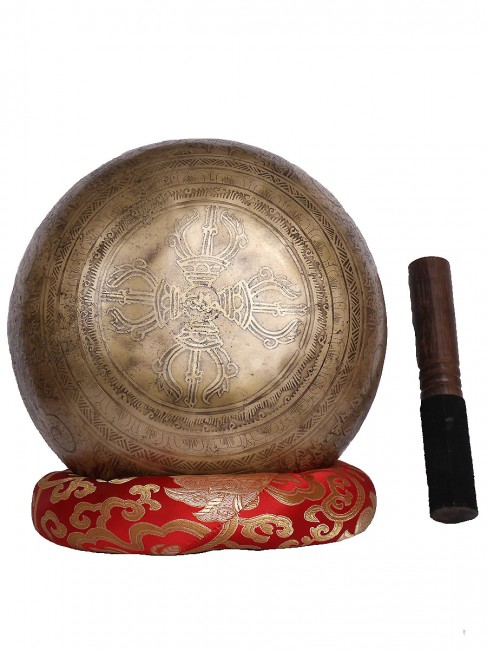 A beautiful inscribed hand crafted singing bowl with Tibetan prayer scripted symbols around the outer wall also it’s embossed with other intricate design on outside and it has abstract Bajra design on the outside bottom. The inner bottom has an enchanting Tibetan letter design etched on. It is made from the combination of seven different metals. The singing bowl produces a relaxing and harmonious sound which is used for yoga, music therapy, to clean the atmosphere around us and sound healing. It comes with free wooden Mallet and Silk cushion.