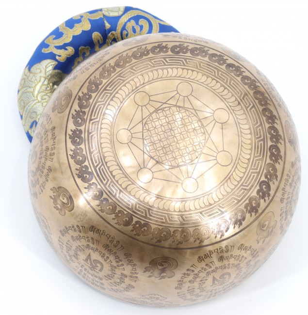 AUTHENTIC HAND HAMMERED (BEATEN) AND SPECIAL HAND CARVING TIBETAN SINGING BOWL SET — This high-quality Flower of Life with Om handcrafted meditation bowl set includes a wooden striker and hand sewn cushion. It is hand hammered in the Himalayan Foothills by Nepalese artisans to be as unique as you are and to create an ambience for emotional calming & healing.