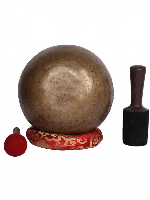 A beautiful inscribed hand crafted singing bowl with Tibetan prayer scripted symbols around the outer wall also it’s embossed with other intricate design on outside and it has abstract Om design on the outside bottom. The inner bottom has an enchanting Tibetan design etched on. It is made from the combination of seven different metals. The singing bowl produces a relaxing and harmonious sound which is used for yoga, music therapy, to clean the atmosphere around us and sound healing. It comes with free wooden Mallet and Silk cushion.