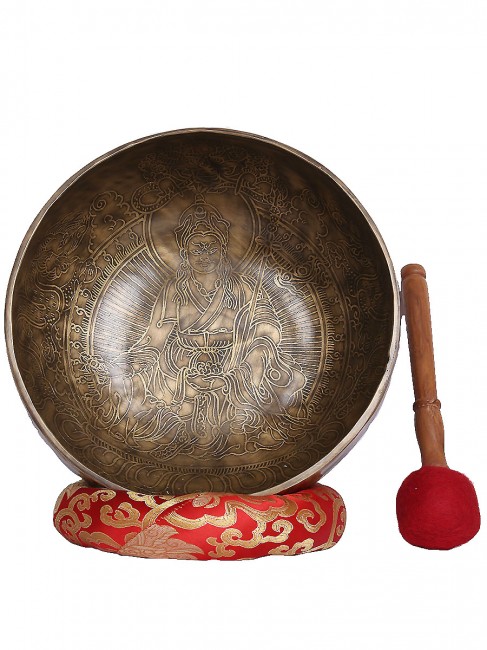 A beautiful inscribed hand crafted singing bowl with Tibetan prayer scripted symbols around the outer wall and it has abstract Sun design on the outside bottom. The inner bottom has intricate God Figure design etched on. It is made from the combination of seven different metals. The singing bowl produces a relaxing and harmonious sound which is used for yoga, music therapy, to clean the atmosphere around us and sound healing. It comes with free wooden Mallet and Silk cushion.