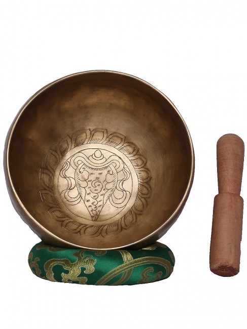 A beautiful inscribed hand crafted singing bowl with an embossed Tibetan inscription (mantra) design on outside and inside it has an embossed Sankha design. It is made from the combination of seven different metals. The singing bowl produces a relaxing and harmonious sound which is used for yoga, music therapy, to clean the atmosphere around us, religious ceremonies and sound healing. It comes with free wooden Mallet and Silk cushion.