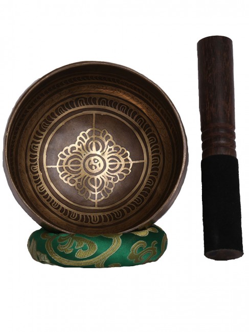 A beautiful inscribed hand crafted singing bowl with big symbolic Tibetan letter around the outer wall also it’s embossed with other intricate design on outside and it has abstract Om design on the outside bottom. The inner bottom has abstract Bajra design etched on. It is made from the combination of seven different metals. The singing bowl produces a relaxing and harmonious sound which is used for yoga, music therapy, to clean the atmosphere around us and sound healing. It comes with free wooden Mallet and Silk cushion.