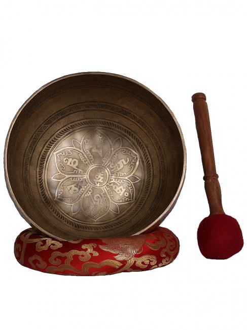 A beautiful inscribed hand crafted singing bowl with big symbolic Tibetan letter around the outer wall also it’s embossed with other intricate design on outside and it has abstract Ashtamangala with Om design on the outside bottom. The inner bottom has intricate Lotus with Tibetan letter etched on. It is made from the combination of seven different metals. The singing bowl produces a relaxing and harmonious sound which is used for yoga, music therapy, to clean the atmosphere around us and sound healing. It comes with free wooden Mallet and Silk cushion.