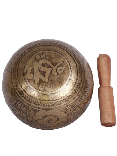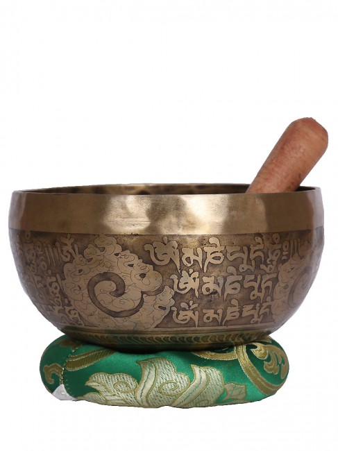 A beautiful inscribed hand crafted singing bowl with big symbolic Tibetan letter around the outer wall also it’s embossed with other intricate design on outside and it has abstract Om design on the outside bottom. The inner bottom has intricate Tibetan letter design etched on. It is made from the combination of seven different metals. The singing bowl produces a relaxing and harmonious sound which is used for yoga, music therapy, to clean the atmosphere around us and sound healing. It comes with free wooden Mallet and Silk cushion.