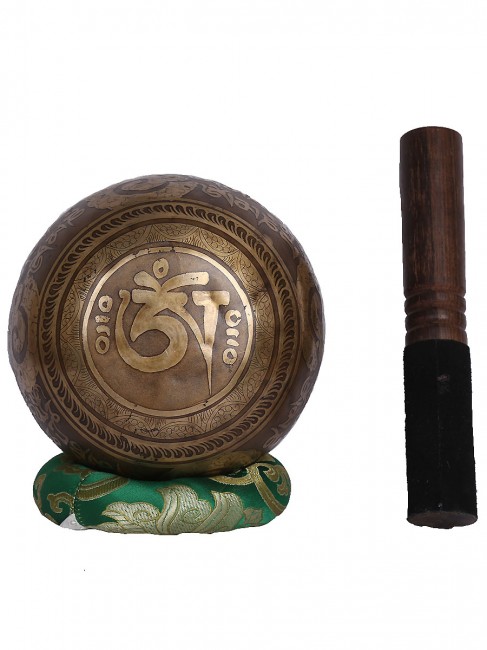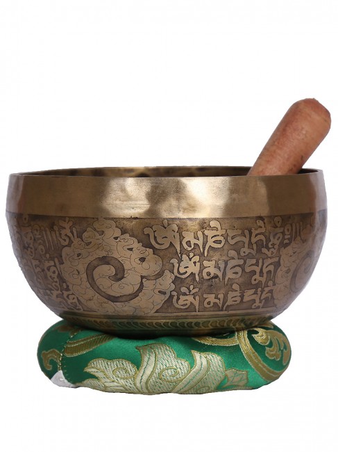 A beautiful inscribed hand crafted singing bowl with an embossed Tibetan inscription (mantra) around the outer wall and other intricate design also it has abstract Om design on outside bottom. In the inner bottom with an embossed Bajra design etched on. It is made from the combination of seven different metals. The singing bowl produces a relaxing and harmonious sound which is used for yoga, music therapy, to clean the atmosphere around us and sound healing. It comes with free wooden Mallet and Silk cushion.