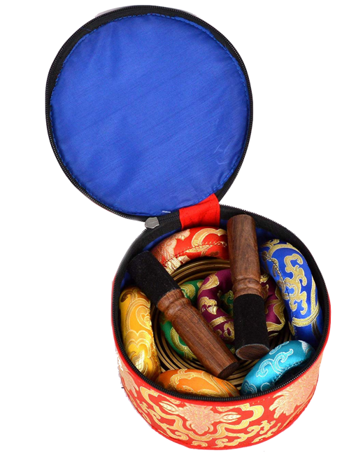 This is a set of seven gorgeous chakra singing bowls made by Seven difrent metal and it comes with seven different singing bowls, Seven Silk cushion, Seven Rose wood striker (mallets), Deather for dtriker. These singing bowls are between 3.5" to 5" in diameter and weigh 2.8 kilogram together. These bowls sing very easily and produce rich, harmonic and soothing sound that lasts for a long time. Together they produce energetic and vibrating sounds which provided stress free relaxation. These singing bowls has been used for meditation, music, relaxation, personal well being, healing energy and chakra creation etc. They are used by a wide range of professionals, including health professionals, school teachers, musicians and spiritual teachers. Singing bowls are used in health care by psychotherapists, massage therapists, cancer, and stress and meditation specialists.
