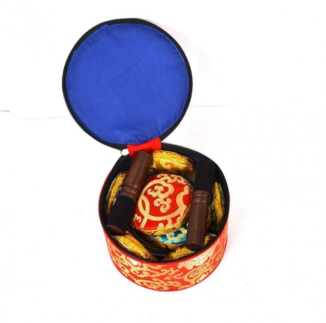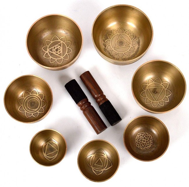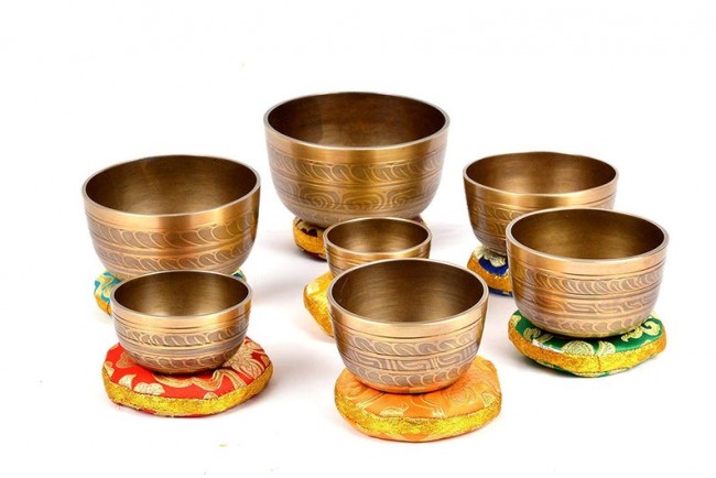 This is a set of seven gorgeous chakra singing bowls made by Seven difrent metal and it comes with seven different singing bowls, Seven Silk cushion, Seven Rose wood striker (mallets), Deather for dtriker. These singing bowls are between 3.5" to 5" in diameter and weigh 2.8 kilogram together. These bowls sing very easily and produce rich, harmonic and soothing sound that lasts for a long time. Together they produce energetic and vibrating sounds which provided stress free relaxation. These singing bowls has been used for meditation, music, relaxation, personal well being, healing energy and chakra creation etc. They are used by a wide range of professionals, including health professionals, school teachers, musicians and spiritual teachers. Singing bowls are used in health care by psychotherapists, massage therapists, cancer, and stress and meditation specialists.